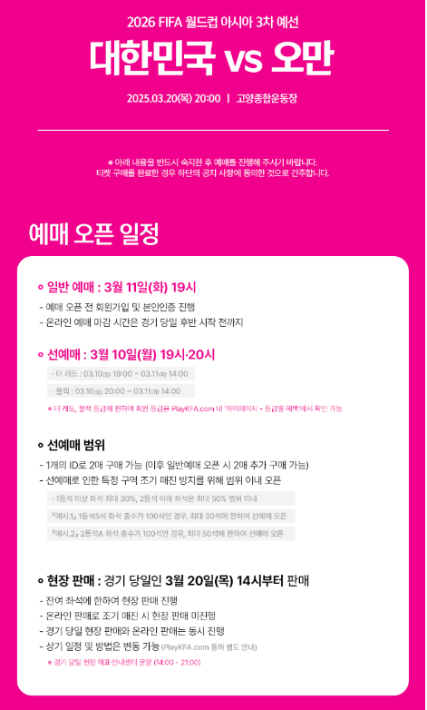 | 예매 | 한국 vs 오만 | 한국 vs 요르단 | |